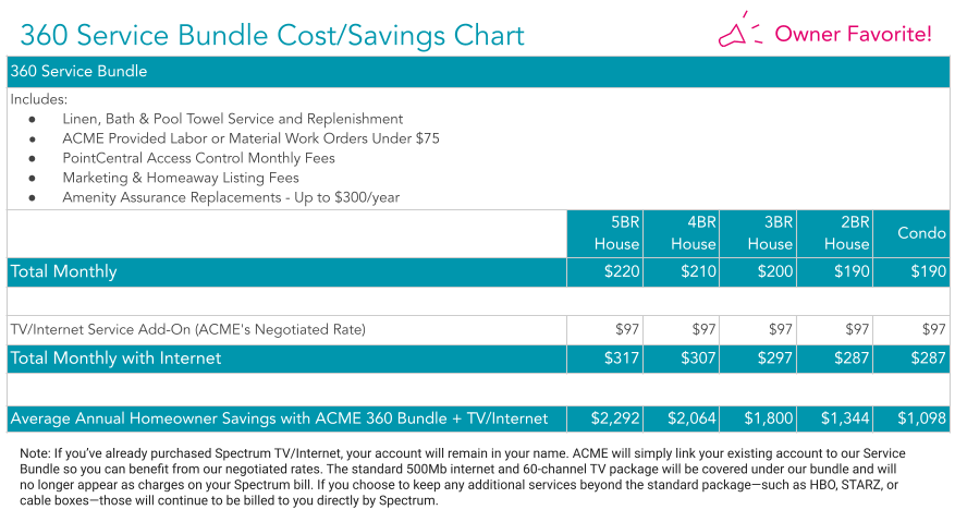 Your 360 Service Bundle can be set up WITHOUT Internet/TV service at one price (see chart, you'd keep your current setup and keep paying the bill directly to your provider), or you can ADD ON Spectrum Internet/TV service to your 360 Service Bundle for $97/month. If you've already purchased Spectrum Internet/TV, the account would continue to be owned by the you the Homeowner, we simply add you to our Service Bundle to allow for you to take advantage of the lower costs. The basic Internet/TV service would then be billed to ACME.